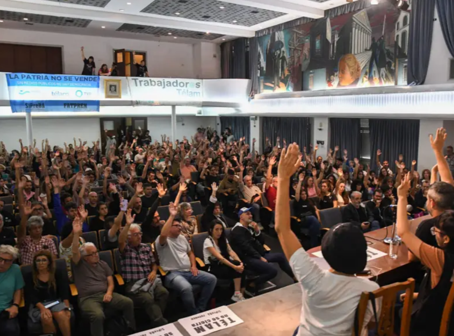 Los trabajadores de la agencia de noticias Télam, nucleados en el Sindicato de Prensa de Buenos Aires (Sipreba), realizaron hoy una masiva asamblea en el histórico salón Felipe Vallese de la CGT de la calle Azopardo, en la que se acordó rechazar el programa de retiros voluntarios ofrecido por el interventor de la empresa, Diego Chaher, mantener el acampe en sus dos sedes y reforzar otras acciones ante la amenaza de cierre del medio público.