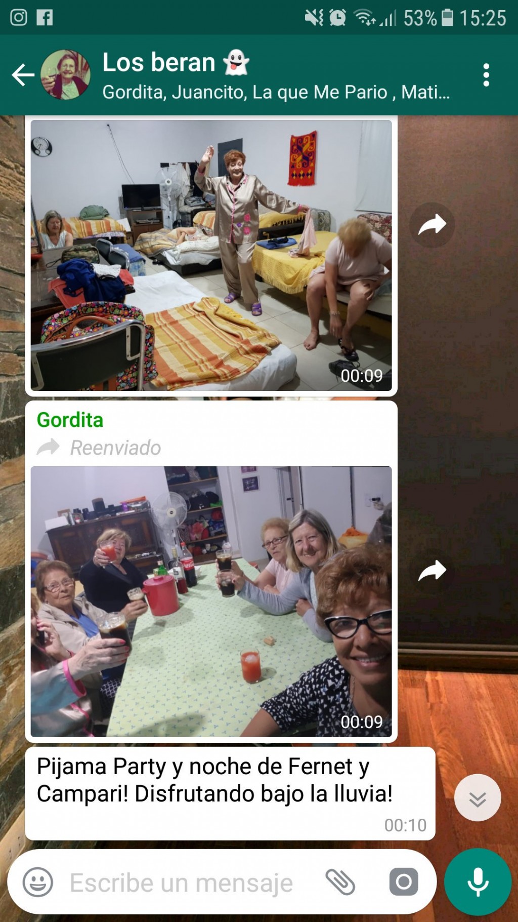 En uno de los archivos que compartió @juaniartal, muestra una captura de un chat que mantiene con su familia en el que la abuela dice: "Pijama Party y noche de fernet y campari". Además, la nieta de la simpática mujer compartió tres fotos de la noche de diversión de este grupo de mujeres. En la primera, se ve a una abuela muy contenta, en pijama, lista para ir a dormir. En las otras dos, las mujeres levantan sus vasos para brindar.