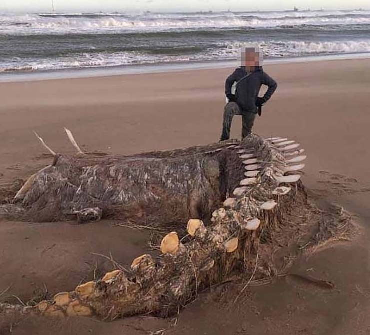 "Encontré esta extraña criatura hoy cerca de Aberdeen. ¿Alguna idea de lo que es?", preguntó a sus seguidores tras compartir la fotografía del cadáver. En la imagen un niño coloca una de sus piernas sobre la cabeza de la criatura, de la que solo queda su esqueleto medio enterrado en la arena, como si la hubiera derrotado.