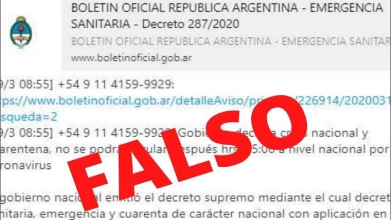 “En las últimas horas han circulado mediante redes sociales y sistema de mensajería instantánea información falsa que daría cuenta de la existencia de un decreto presidencial que dispondría la crisis nacional, cuarentena y la prohibición de circular desde las 15 horas del día de la fecha junto con un enlace del Boletín Oficial”, sostuvo la fiscal en el requerimiento.