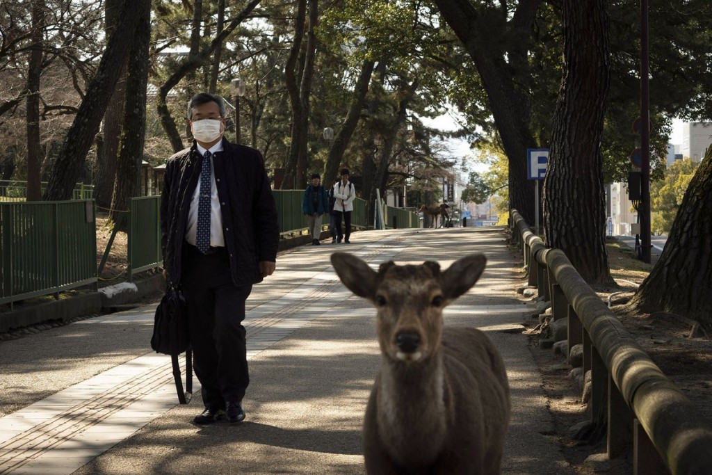 En Nara, Japón, se observaron pequeñas mandas de ciervos Sika, una especie local del Parque Nara, quienes deambulan por las calles en busca de comida.