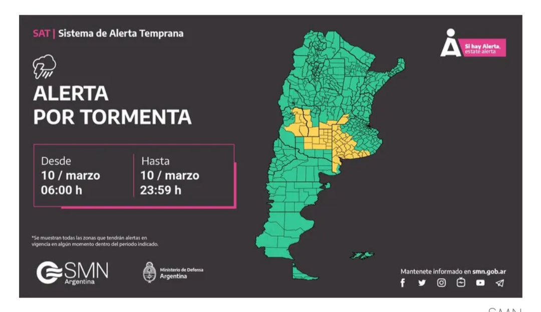 El alerta por tormenta abarca el sur y oeste de la provincia de Buenos Aires, el sur de Santa Fe, el sur de Córdoba y el norte y este de La Pampa, donde se pronostican acumulados de entre 40 y 60 mm. También gran parte de San Luis y el este de Mendoza, donde se esperan entre 15 y 40 mm.