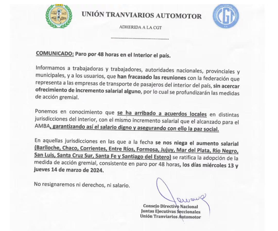Ante el fracaso de una nueva reunión paritaria entre la Unión de Tranviarios Automotor (UTA) y los empresarios del sector, el gremio anunció un nuevo paro de 48 horas para este miércoles y jueves que afectará a un distrito de la provincia de Buenos Aires y diez provincias del país.