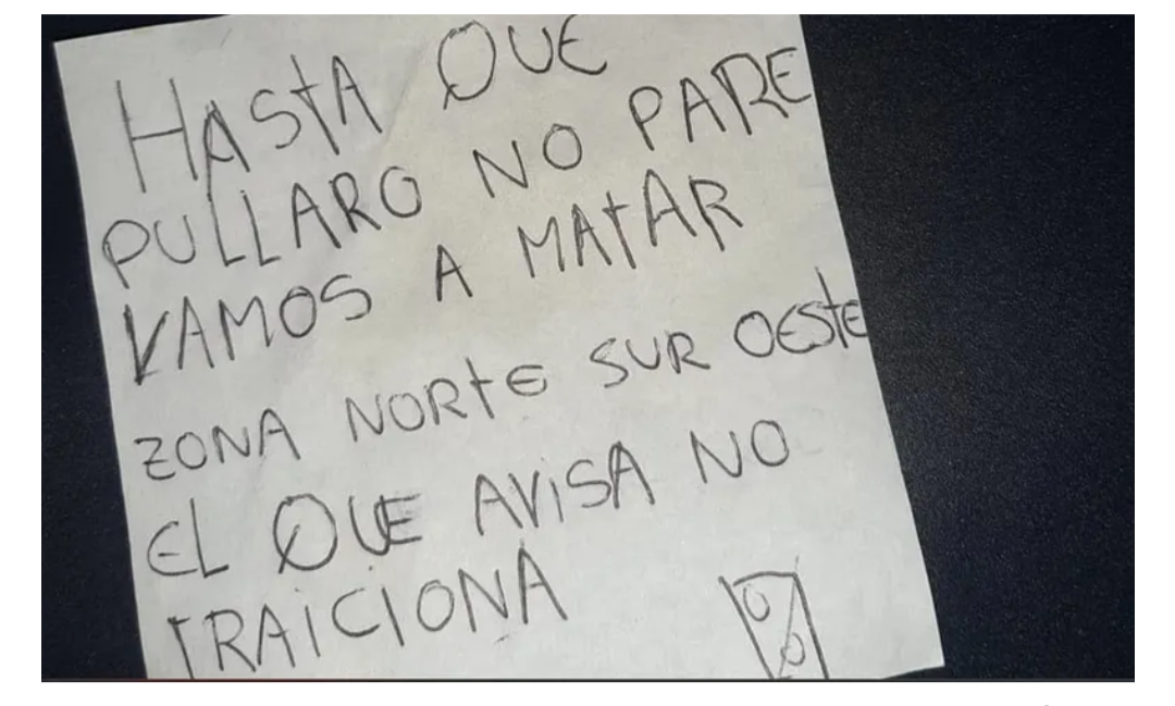 “Hasta que Pullaro no pare vamos a matar. Zona norte sur oeste. El que avisa no traiciona”, se lee en la nueva nota en el que también se le agregó al pie de la misma un parlante tachado y al que vinculan a las hinchadas de Newell's y Rosario Central. Los investigadores sospechan que es un símbolo de cómo los hinchas de la Lepra tratan a los de la Academia rosarina, a los que llaman “parlante” o “sin aliento”. La misma fue encontrada a pocos metros de distancia del policlínico PAMI 2, frente a la casa de una mujer en la zona norte, quien reportó el mensaje a las autoridades. El lugar no fue baleado, según detalló Infobae. Al mismo tiempo, se reportó otra amenaza a recolectores de residuos en la zona noroeste de la ciudad: dos sospechosos en moto amenazaron a los empleados de la empresa LimpAr cuando hacían sus tareas en Forest y Brasil. Los sospechosos, arriba de una moto negra, se pusieron a la par del camión y el acompañante hizo ademanes de tener un arma de fuego.