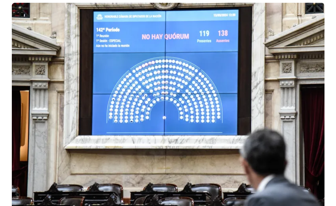 A las 12, hora pautada para el inicio de la sesión, solo bajaron al recinto 119 de los 129 legisladores necesarios para comenzar el debate: 18 de HCF, 5 de la Unión Cívica Radical (UCR), 5 del Frente de Izquierda (FIT) y 91 de Unión por la Patria (UxP). Los bloques de La Libertad Avanza (LLA) y el PRO no se presentaron.